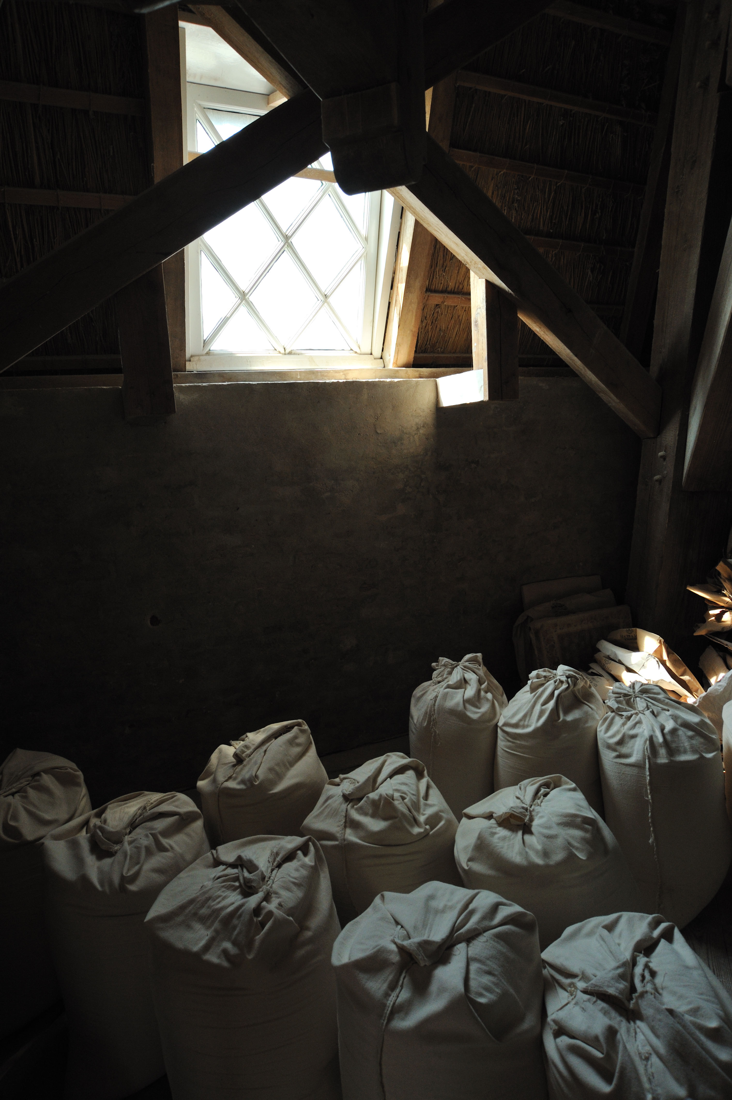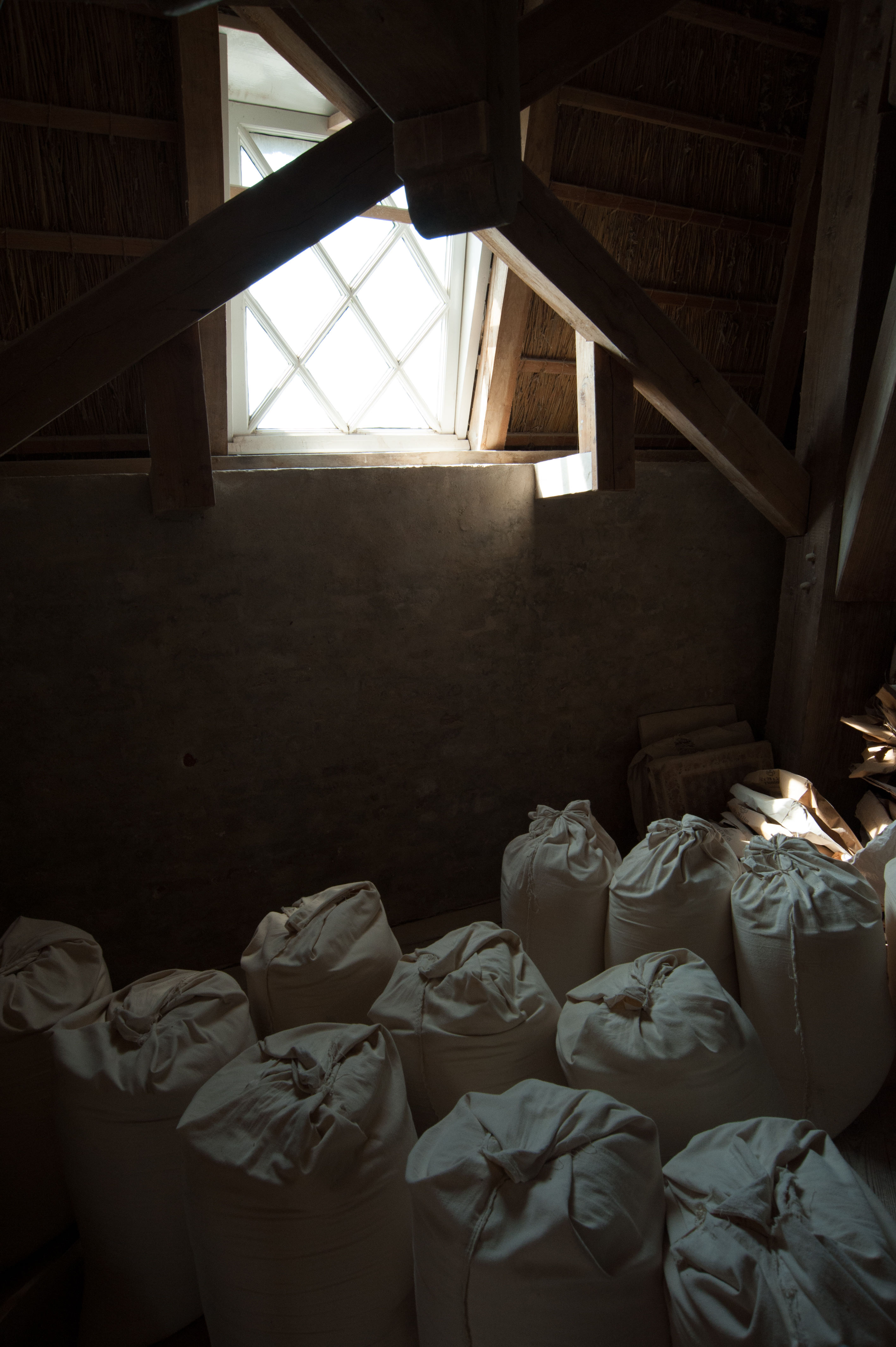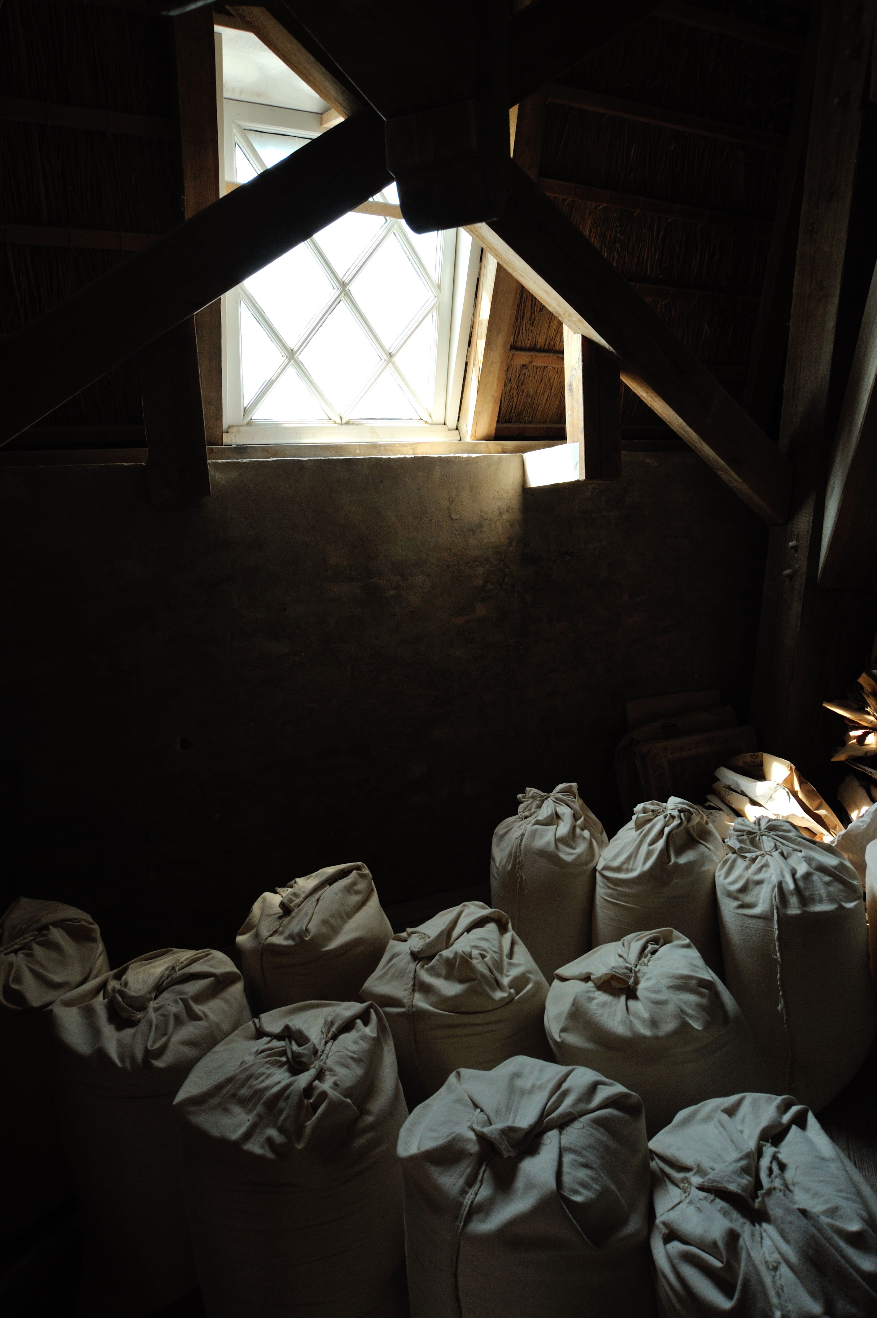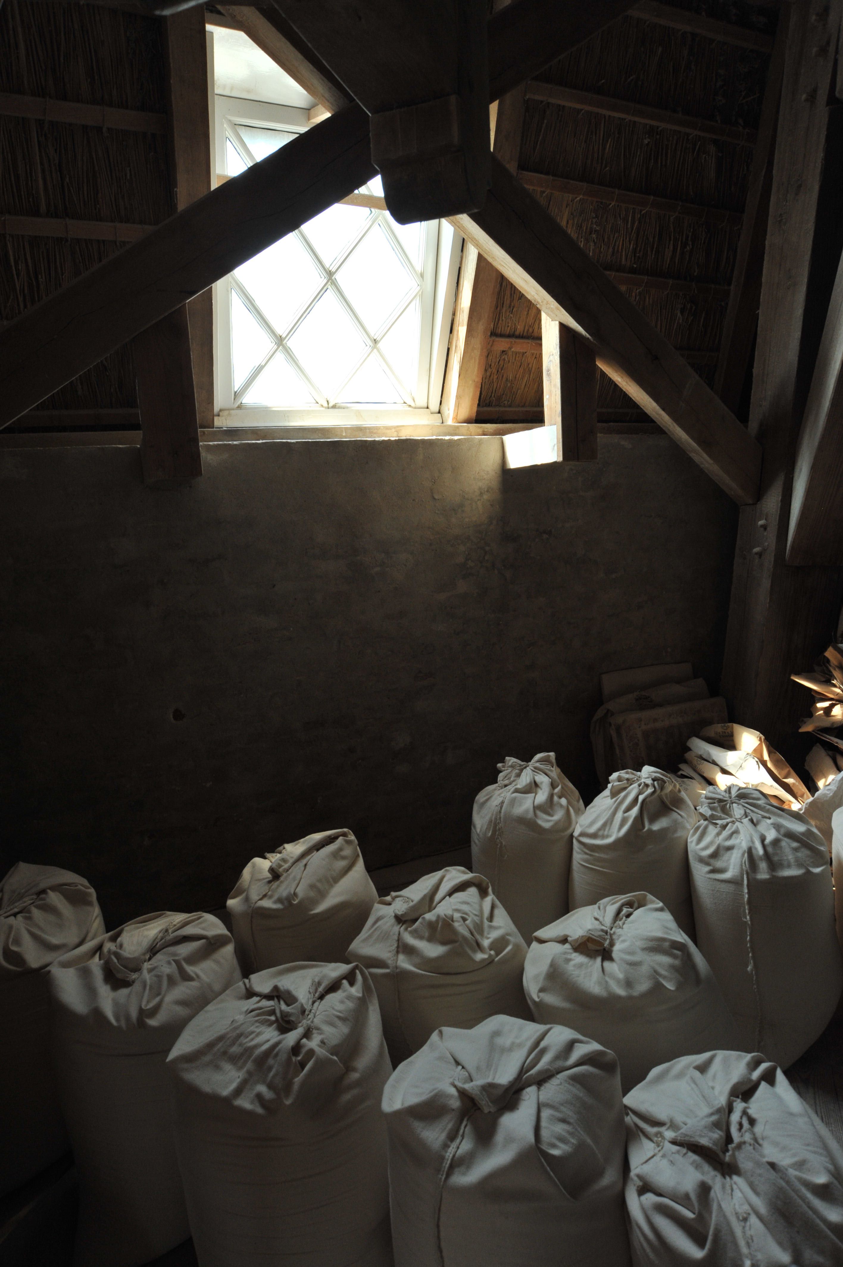Mehlsäcke unter einem Fenster in einer Windmühle.